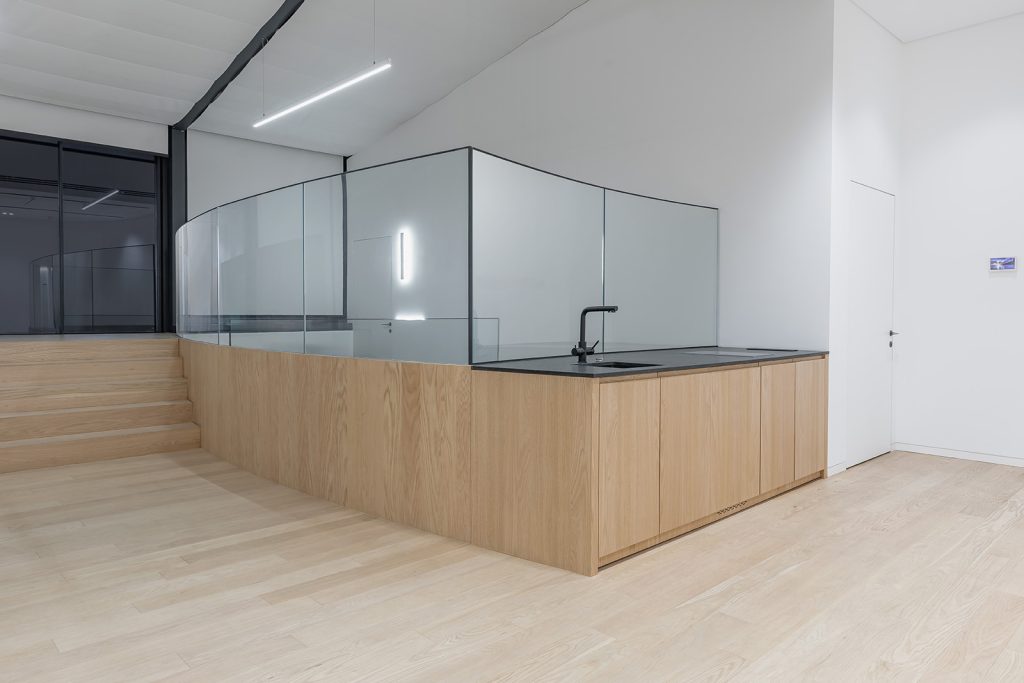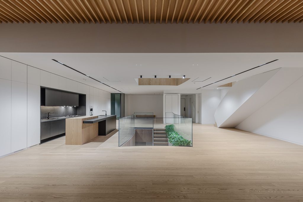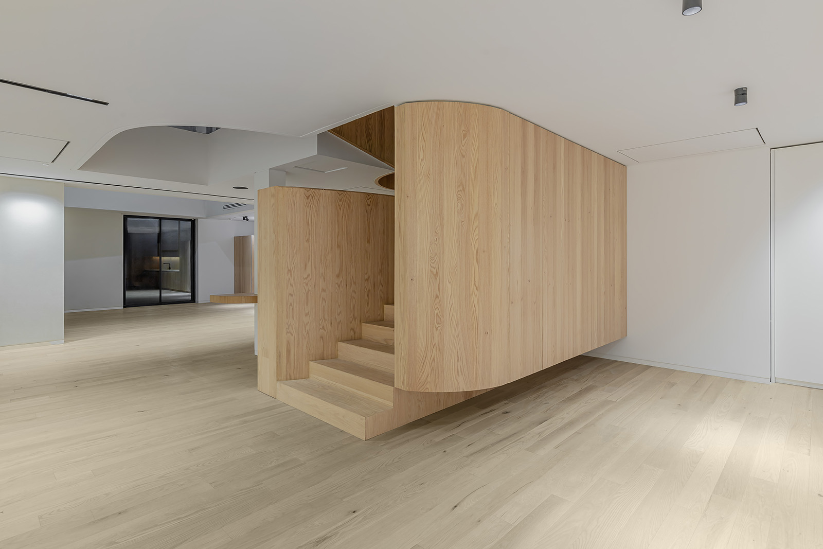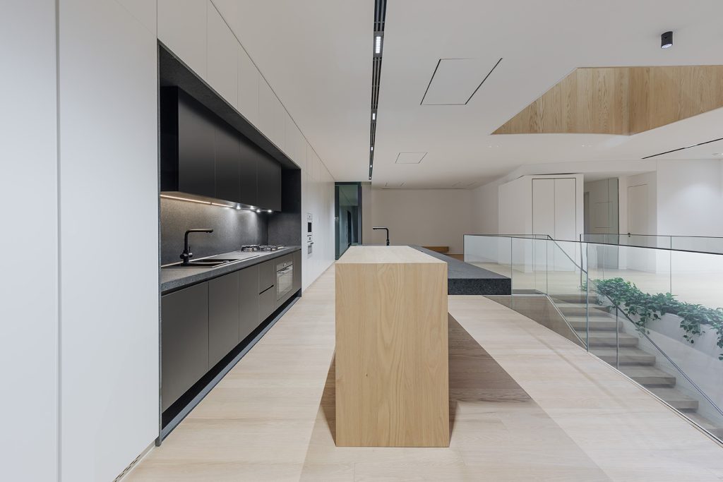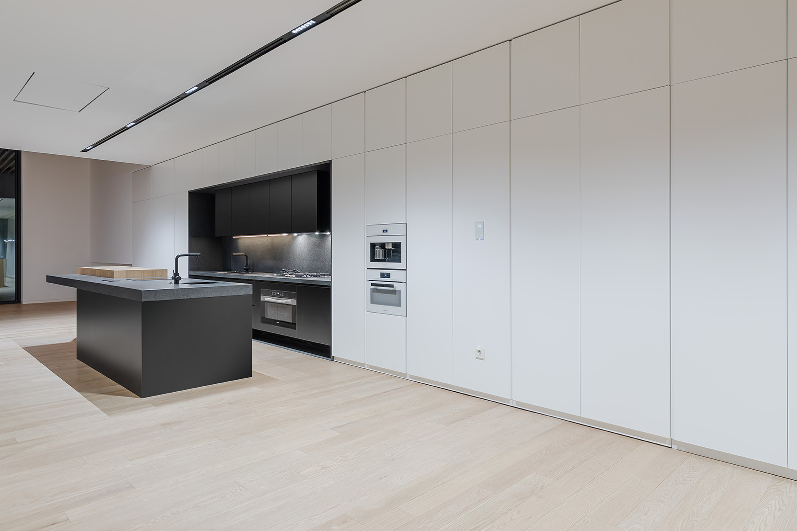 چیدمان این پروژه بر پایهی مینیمالیسم و ترکیب رنگی سفید، مشکی مات و چوب بلوط روشن طراحی شده است.