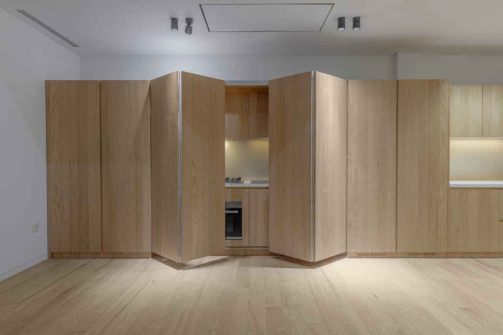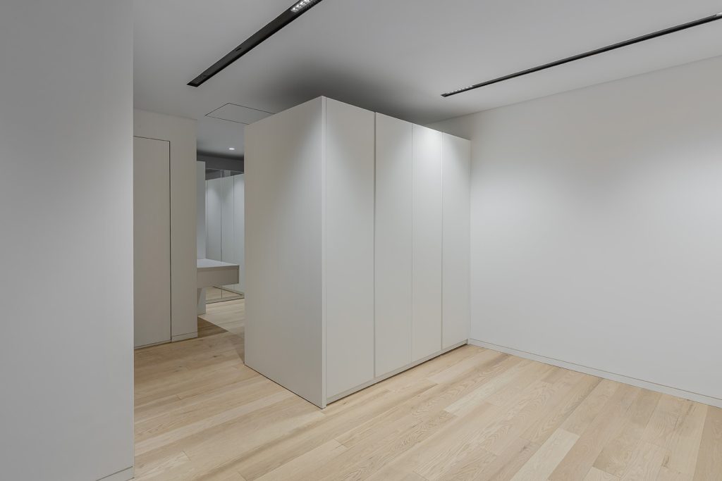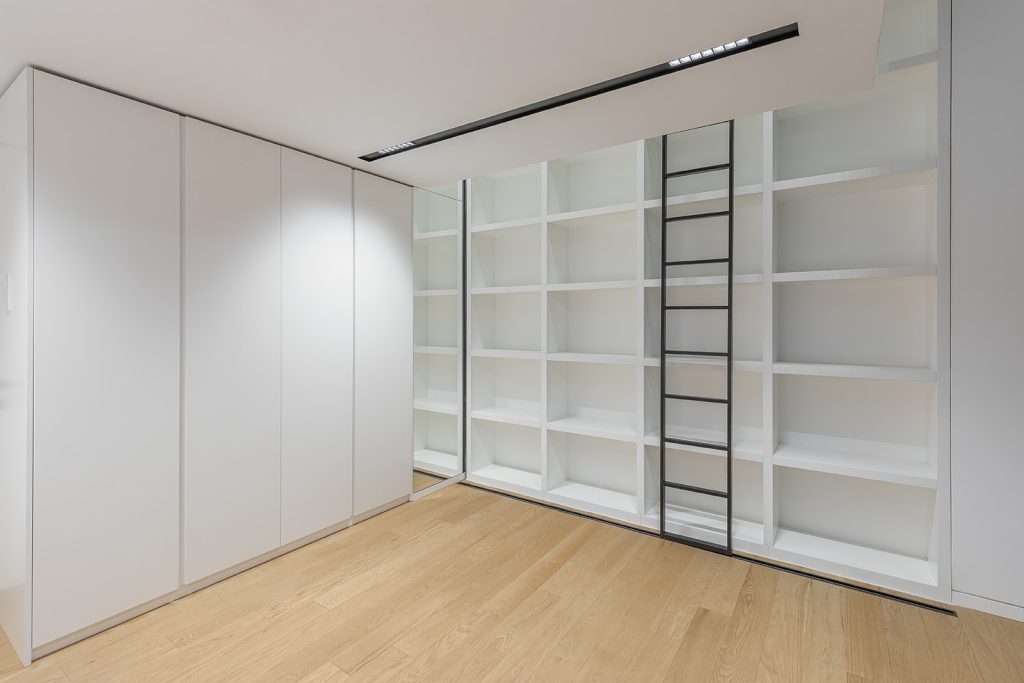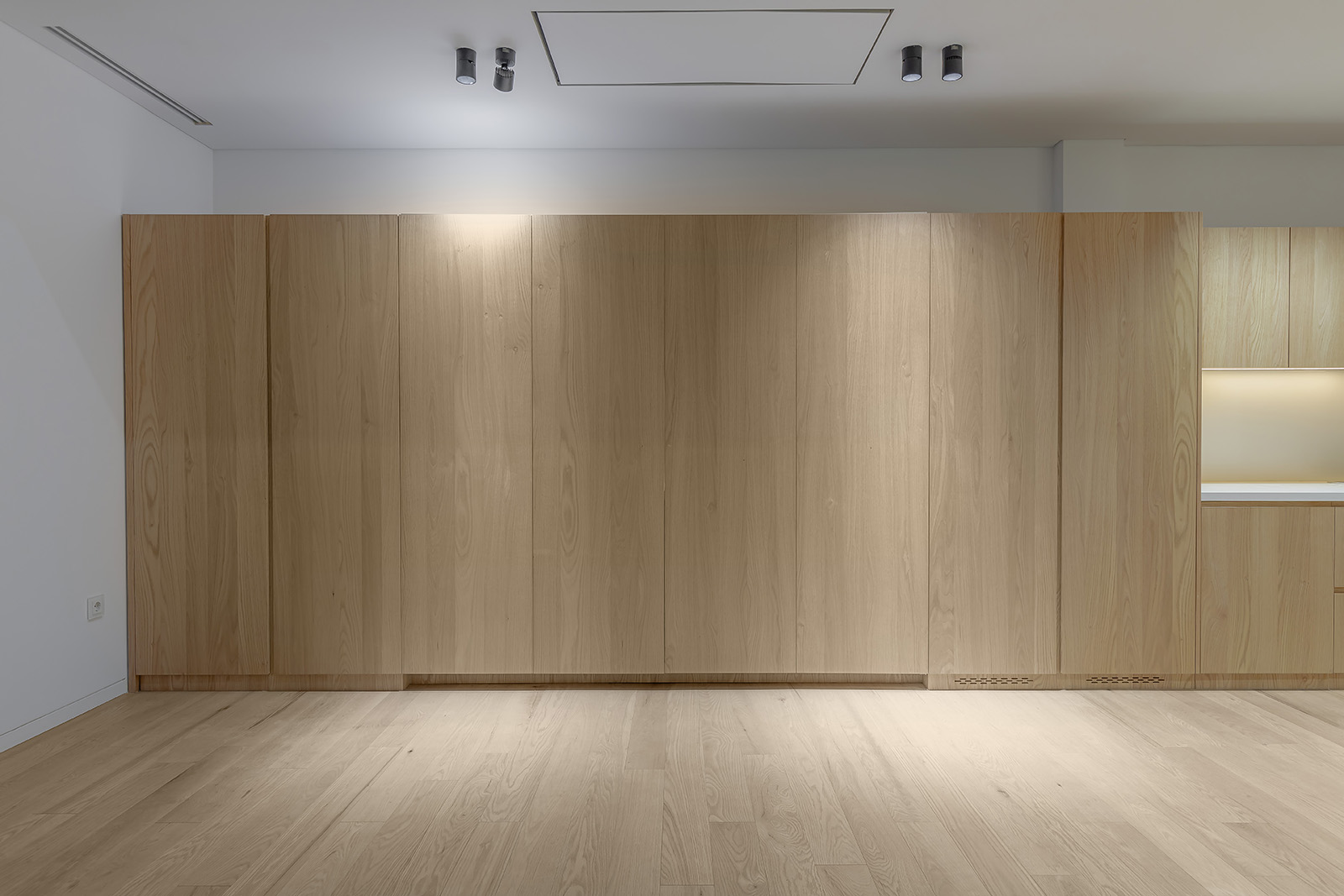 کمدها و کلوزتهای دیواری با دربهای فلت و اتصالات آرامبند ساخته شدهاند تا بیشترین گنجایش با کمترین پرت فضا فراهم شود.