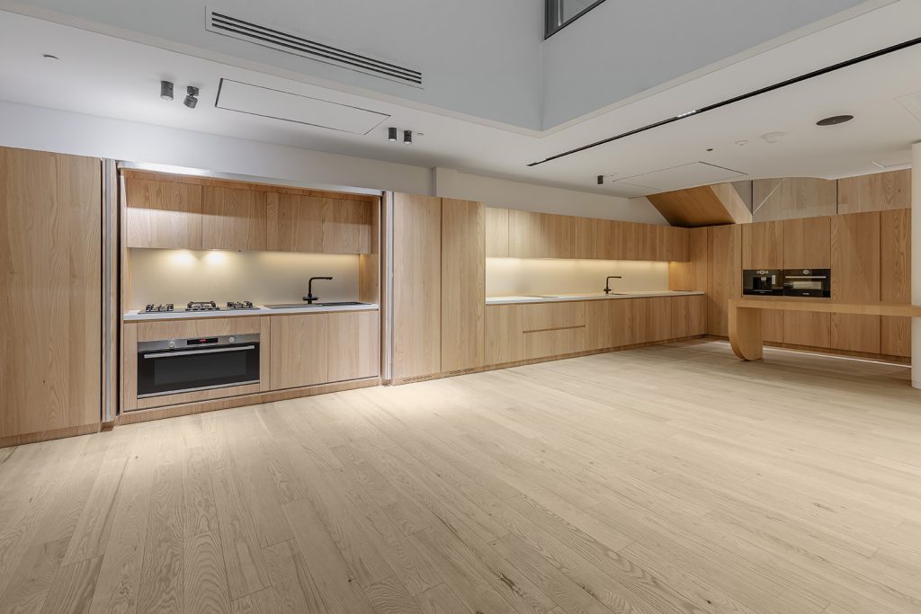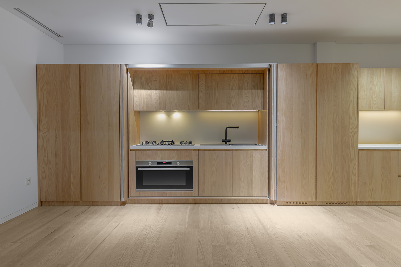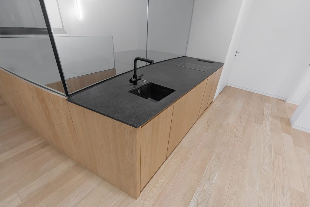 کابینتهای آشپزخانه بهصورت یکدست و بدون دستگیره اجرا شدهاند و با صفحهی سنگی تیره، سینک و شیرآلات مشکی و نورپردازی خطی، ظاهری کاملاً مدرن ایجاد میکنند.